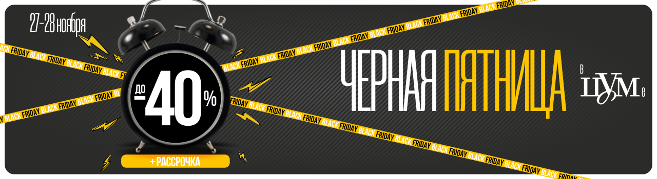 Черная пятница в ЦУМе! 27 и 28 ноября вас ждут невероятные скидки с рассрочкой:- в отделе "Мужская и женская одежда" - до -40%;- в отделе "Детский мир" - 20%; - в отделе "Обувь" - до 20% (за исключением товаров, не участвующих в акции);- в отделе "Ювелирные изделия и часы" до -50%- в...